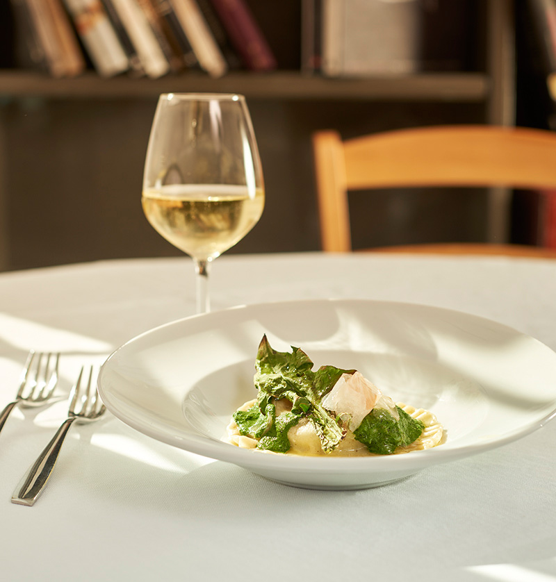 Raviolone di Patate di Bologna D.O.P. e provola, tarassaco, cipollotto e guanciale stagionato