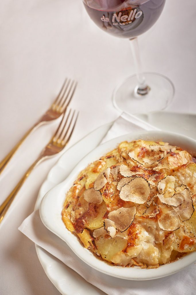 Versa 90 ml circa di crema di latte sul tutto e metti a gratinare in forno ben caldo a 200°C per 8/10 minuti. In uscita dal forno, rifinisci con un’ultima grattata di tartufo e servi ben caldo.
