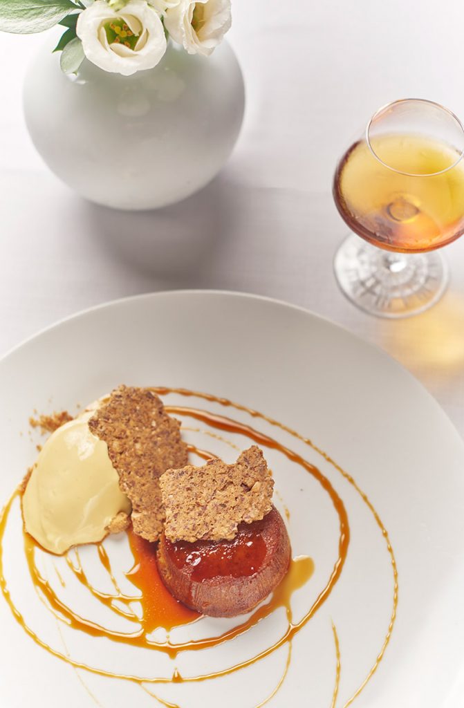 servi il budino tiepido con il caramello e posiziona sul piatto il gelato sopra ad un letto di mandorle tritate e il croccante.